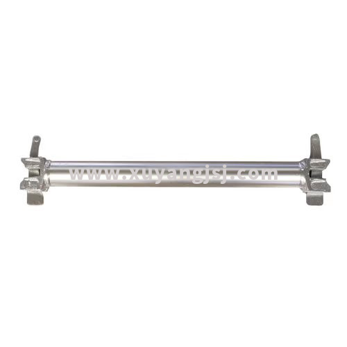 橫桿:材質(zhì)一般采用Q235B,長(zhǎng)度可做成0.6M、0.9M、1.2M、1.5M和2.1M,壁厚2.75MM。由插頭、楔形銷(xiāo)和鋼管組成,橫桿可以扣接在立桿圓盤(pán)上。橫桿樣圖如下所示: